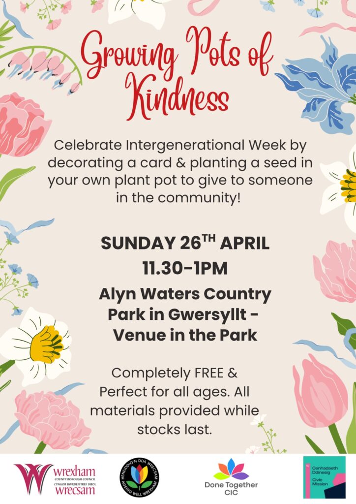 Join Done Together CIC in Alyn Waters Country Park (Gwersyllt) on Sunday 25th April from 11-12.30pm for Growing Pots of Kindness, a lovely and free, family session celebrating Intergenerational Week. Children and young people can decorate a card and plant a seed in their own pot to gift to an older family member, neighbour, or someone in the community who may be feeling lonely and would appreciate a little act of kindness.