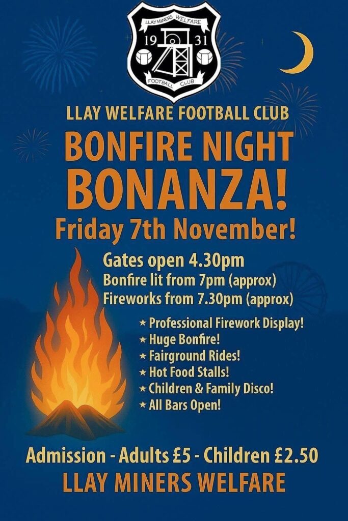 Please see the attached which we have been asked to share, with details of the Bonfire Night extravaganza at the Welfare to support Llay Utd football club.