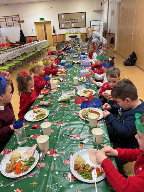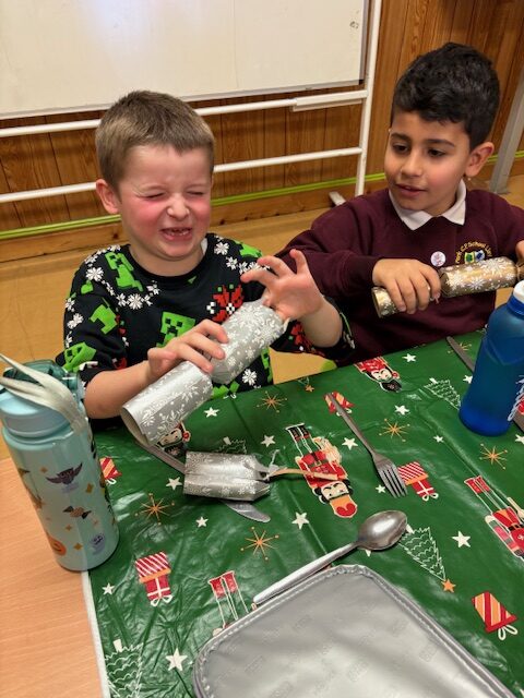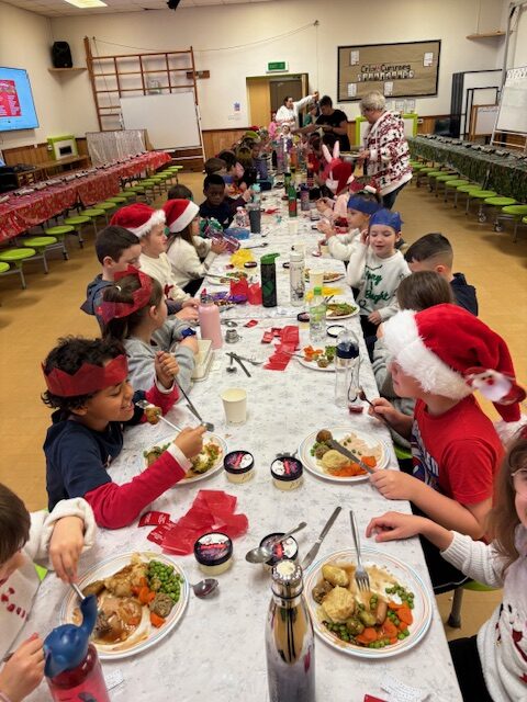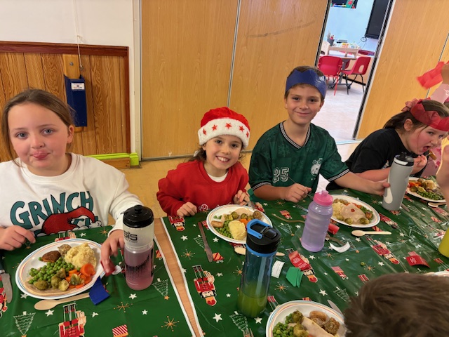 With support from Mrs Davies and staff from across the school, the children had a lovely time pulling crackers, telling jokes, singing along to the Christmas classics (Wham!) and eating up the traditional turkey dinner!