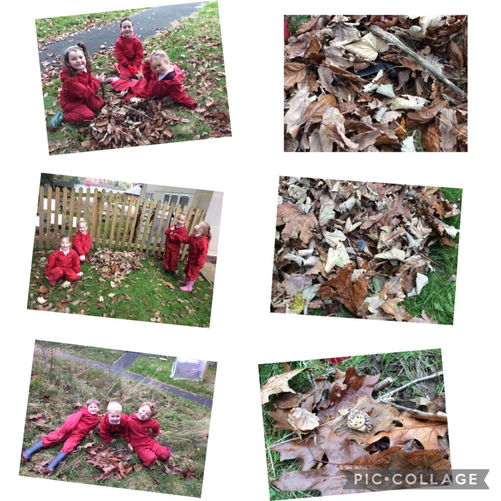 Years 1 & 2: Forest School with Ruby Class Fri, 8th Nov 2024 Today we were talking about hibernation, we made a bed for our hibernators to sleep. We also had lots of fun with the Autumn Leaves.